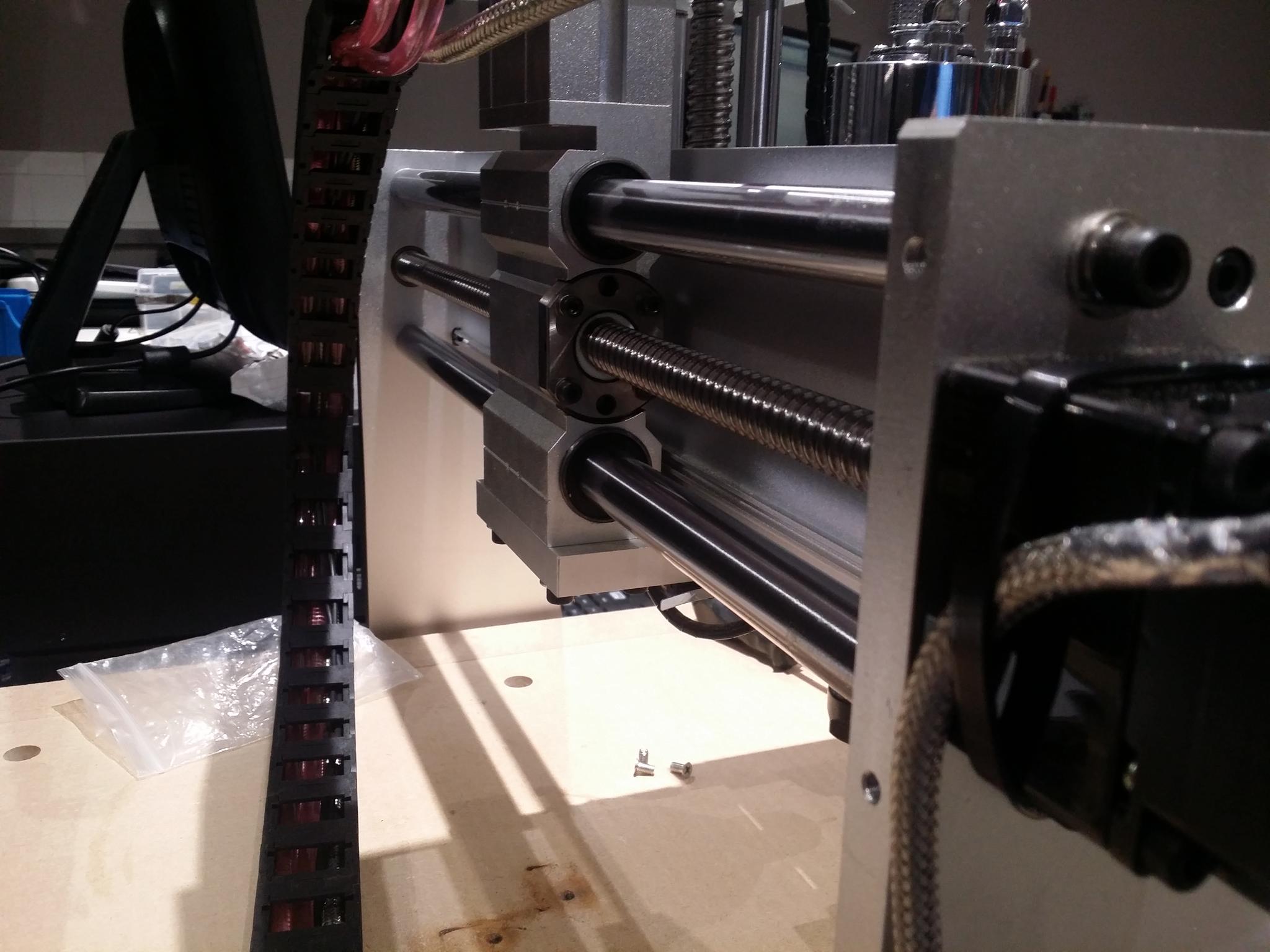 My next area that I'm going to look at is the flexing of the unsupported x-axis 20mm linear bearing shafts. They can be flexed, tilting the spindle back and forth on the y axis direction. With decent pressure on top and bottom of spindle, I can deflect it by as much as 1.5mm (estimate) either way.