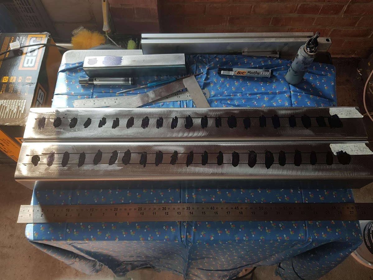 Marking them was a bit of an onerous task, so as my wife had recently taken up 3D printing as a hobby, printed out a jig to prevent me needing to measure! Worked surprisingly well, as our off-the-shelf middle-of-the-range printer is astonishingly accurate on its dimensions. . . . . . . .