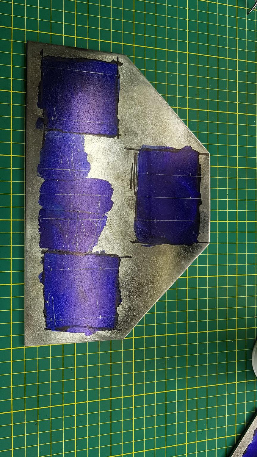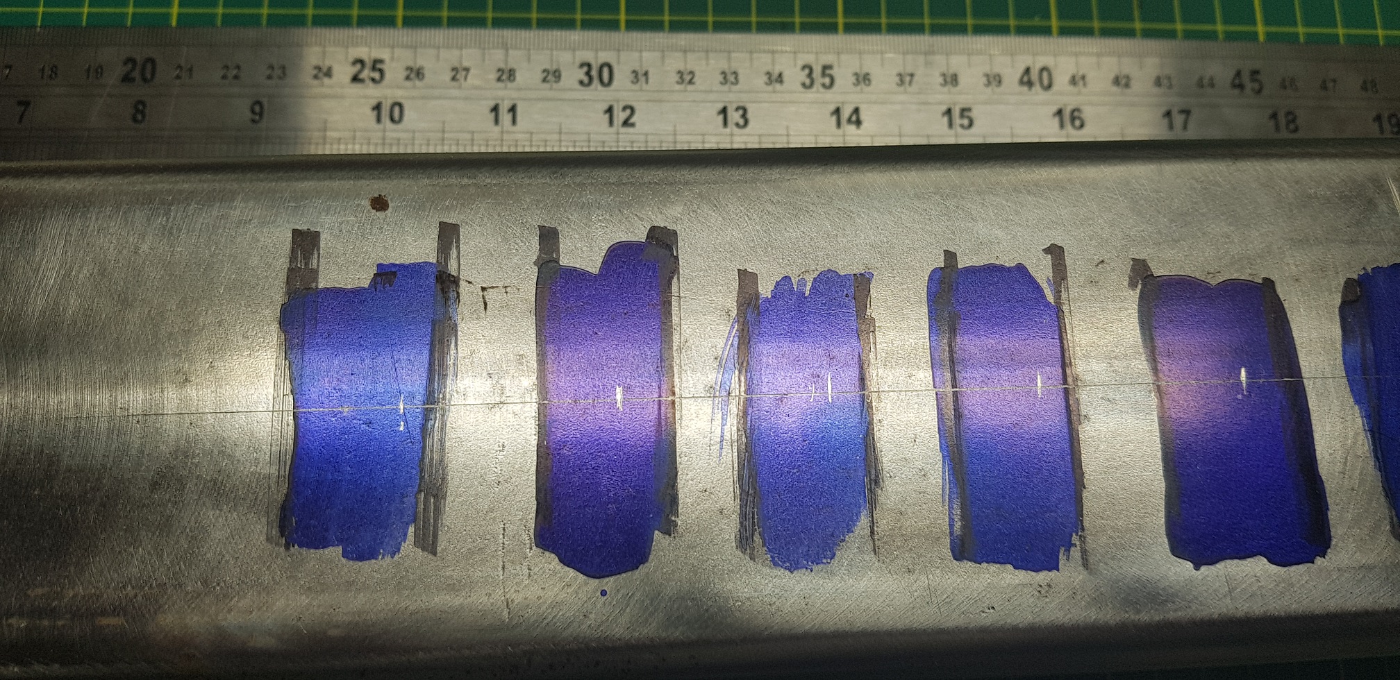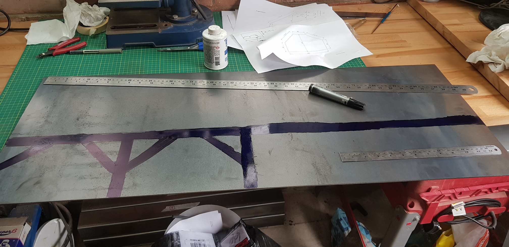 Marking up - discovering what marking up fluid is, and then having to find my own tub! At this point I couldn't wait to layout the steel in approximate locations to give me a better idea of size (wife redacted!)