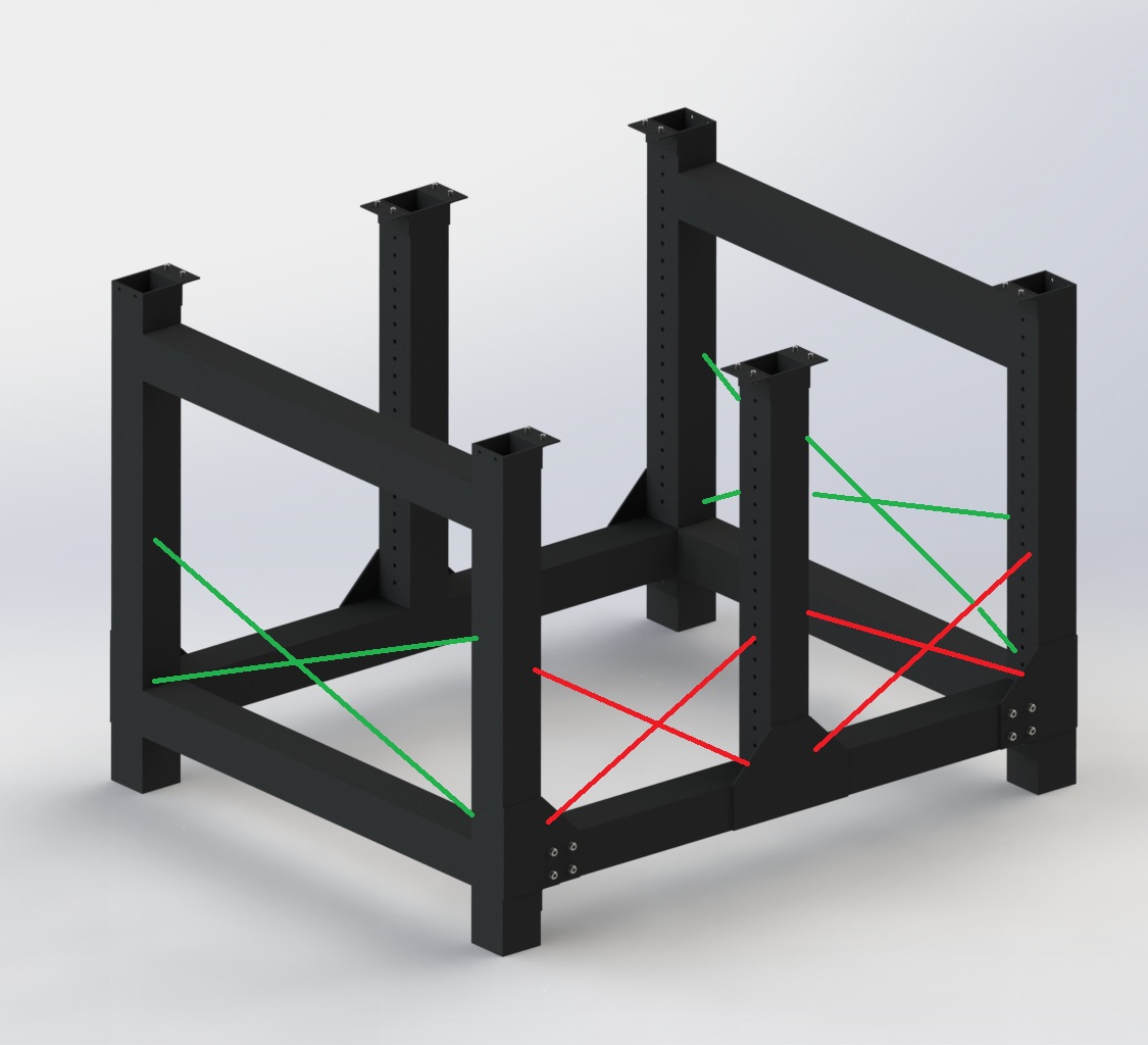 So we're on the same page, I guess you're talking about adding the red lines in the diagram below, rather than the green? I suppose if they were removable bracing they wouldn't foul the adjustable bed permanently... I was hoping to use the lower sections of the frame for a second structure, like a coolant trap or something.