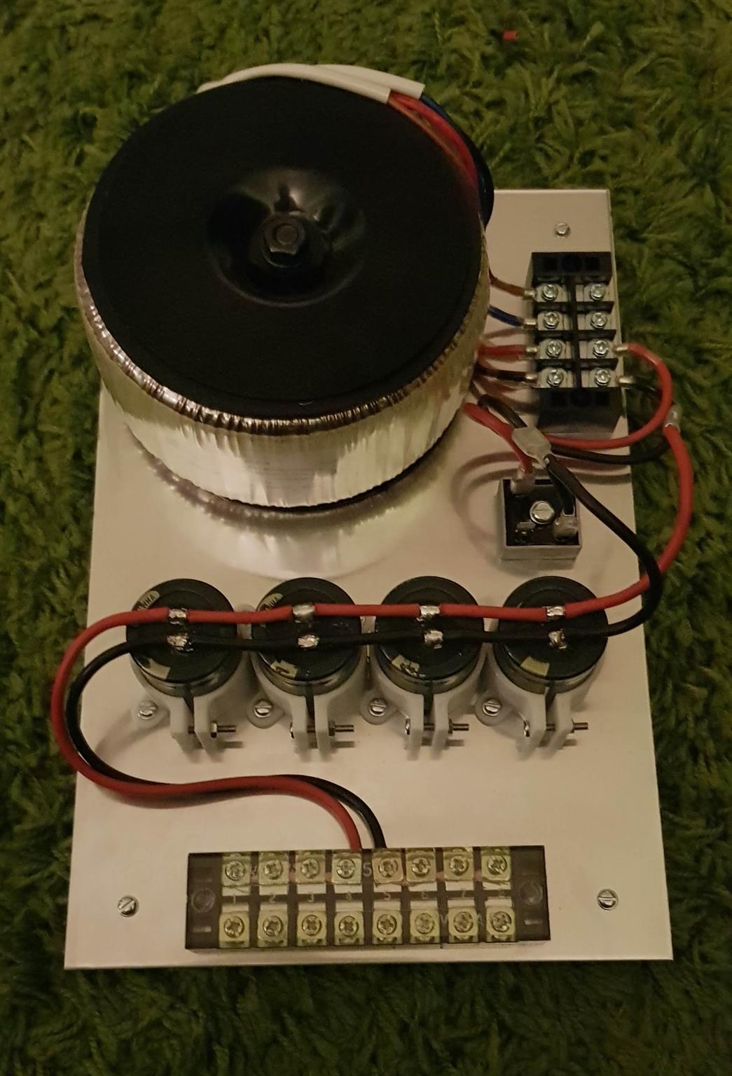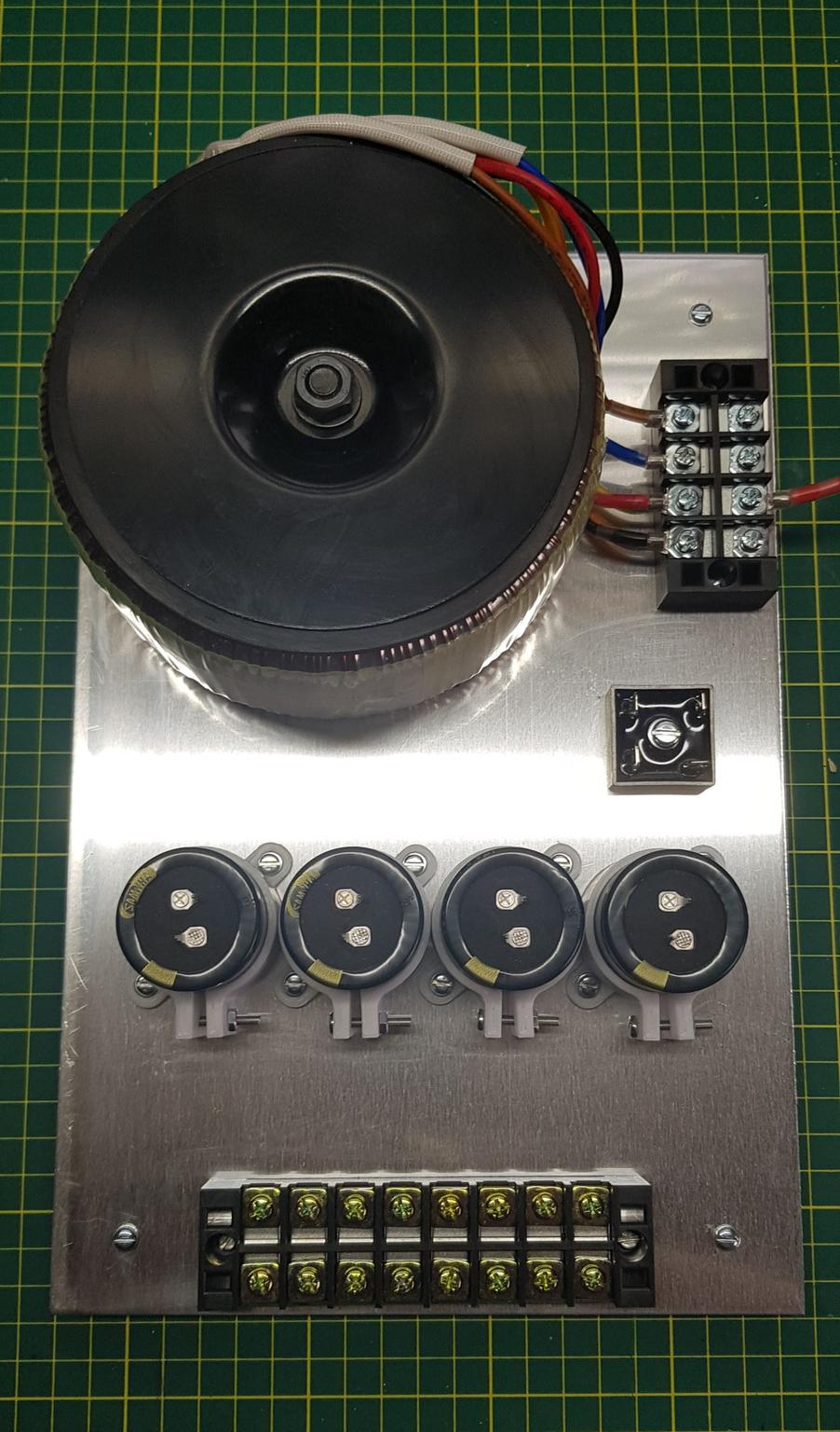 Still needs some hot glue on the caps (I've misplaced the glue gun - d'oh) - Testing will need to wait until the Wife gets back from a work trip, I'm not turning this one on whilst I'm alone in the house! Went with a 625VA with 2x 40V secondaries in the end, gave me 45V on the secondary, so hopefully about 63V after rectification and smoothing.