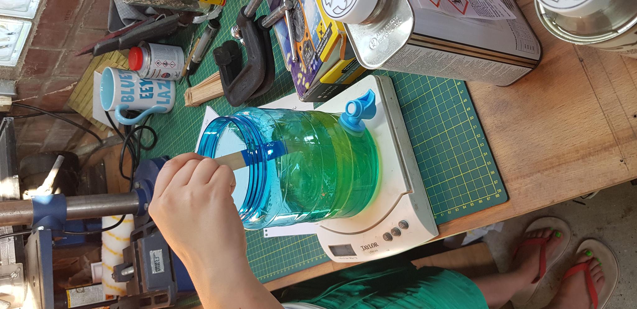 After letting all that silicone set, and a bloody-good chineese takeaway, we set about the epoxying. We measured out and mixed the 1.3L in six equal sets by weight, taking a minute to thoroughly stir after each set. Naturally I got the wife to do this, as she is an expert stirrer.... When we got to the end, we did a two minute stir, then thought it would be a really good idea to let it sit for 10mins to let the bubbles rise out. It was going really really well - the bubbles were rising to the surface nicely, away from our little tap....