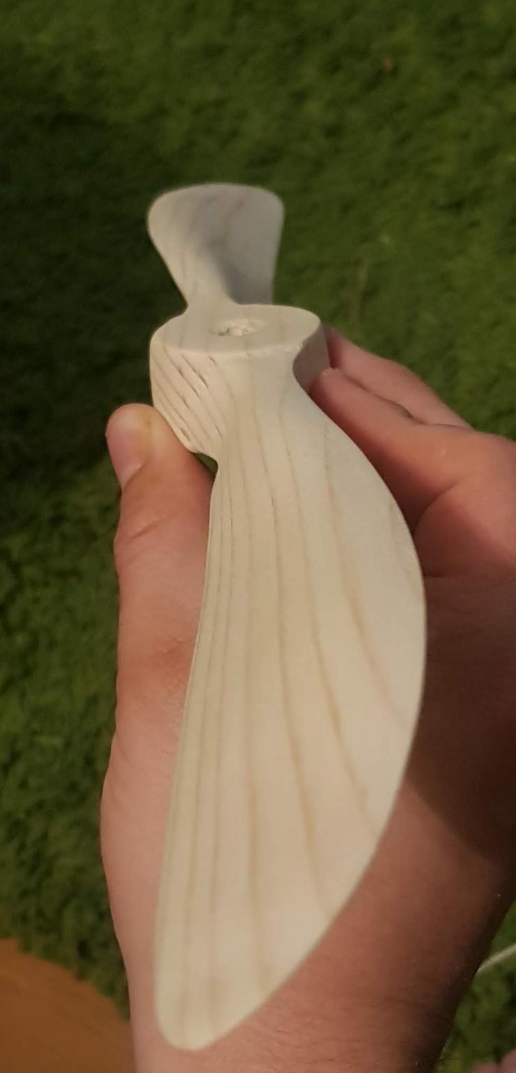 Heres how the prop turned out, after a few duds and a bit more learning. Nothing special, but I'm rather pleased with my first two-sided 3D carve - quite hard to photograph that twisting shape though..