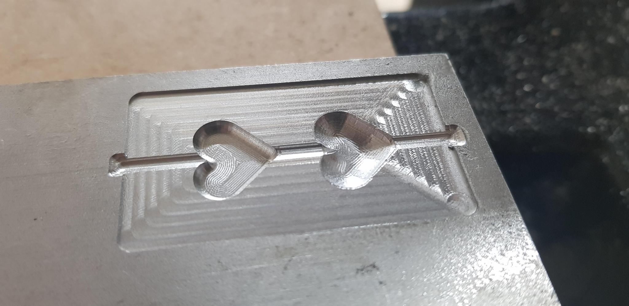 Tried two shapes, a 3D heart and a 2D heart. I pocketed and roughed with a 4mm single flute endmill at 18k RPM and 1.5m/min. Kept the DOC very low at 0.5mm as this is my first time, but the router wasn't phased in the slightest. Then finished with a 3mm Diameter ball nose, 24k RPM 1m/min. Very basic tool paths from aspire, nothing fancy. Went a bit overkill and gave it lots of air blasts to clear the ships and plenty of WD40 in between!