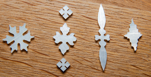 Inlays – normally in a shell of some sort, bone, resins, various hardwoods, rarely metal (brass or aluminium)