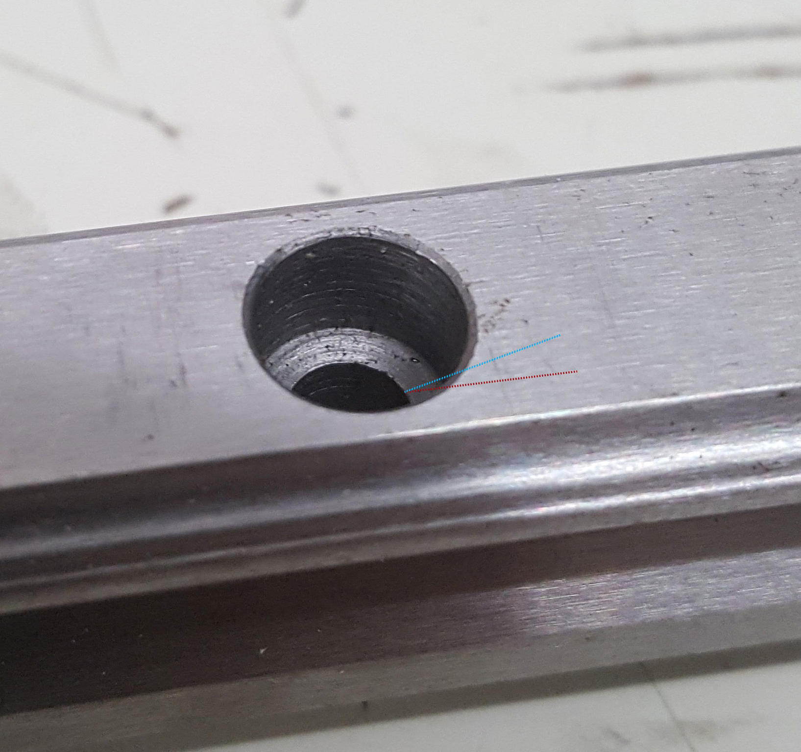Here is a photo of one rail (click to biggy). I don't know if you can tell that the bottom of the hole is not 100% flat, it has a very gentle chamfer, like it was drilled rather than milled out with a flat bottom end-mill. I think it is less steep than a standard screw countersink, but also not 100% flat.