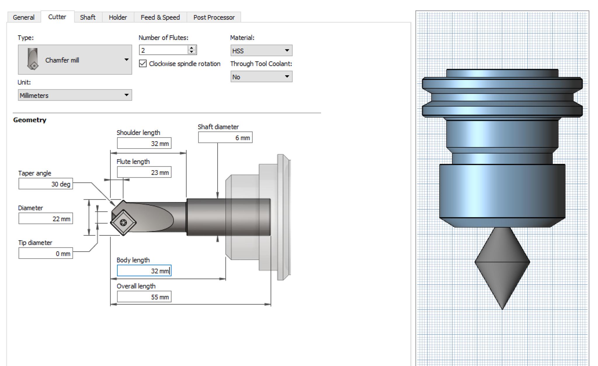 If you want amore accurate representation, use a Tapered Mill, and set the tip diameter to 0.0000001.