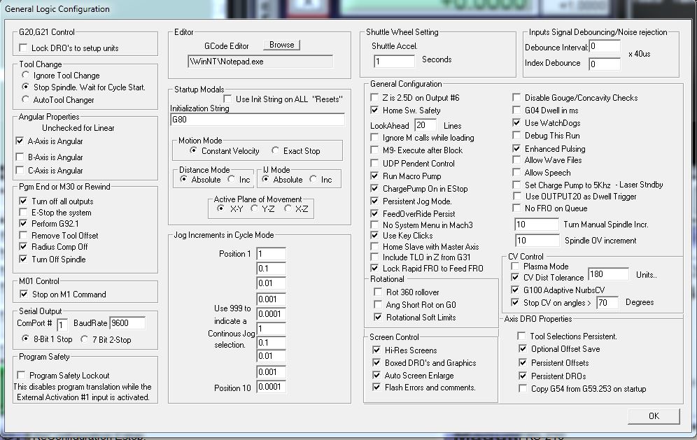 If behaviour differs with code from different CAM packages that strongly suggests your issue is code, not controller or it's settings, most of which are not on the General Config tab.Last edited by magicniner; 26-06-2018 at 08:42 AM.