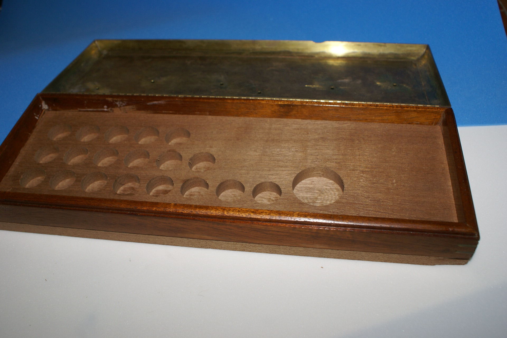 There are a couple of obvious faults - the sapele insert had a corner knocked off and the catch is not on straight. Also the double sided tape used to hold the foam sandwich to a piece of HIPS got smeared on the foam cut-outs.