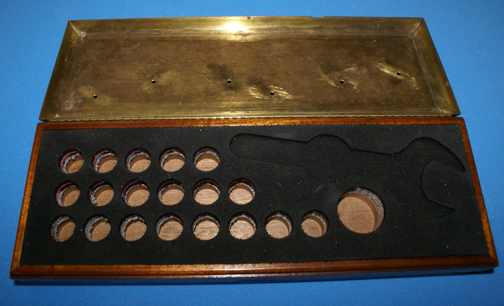The donor case was made by my son 25 years ago as a Degree Show (BA 3D Design) exhibit and it contained a 'partickly narsty' bladed knuckle duster (which has been cut up long since). I knocked out the bottom and made a new one to give extra depth and then made a sandwich of closed cell foams to cut an insert.