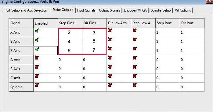 this is the Mach pins & ports page to find the pins assigned to control your stepper motors