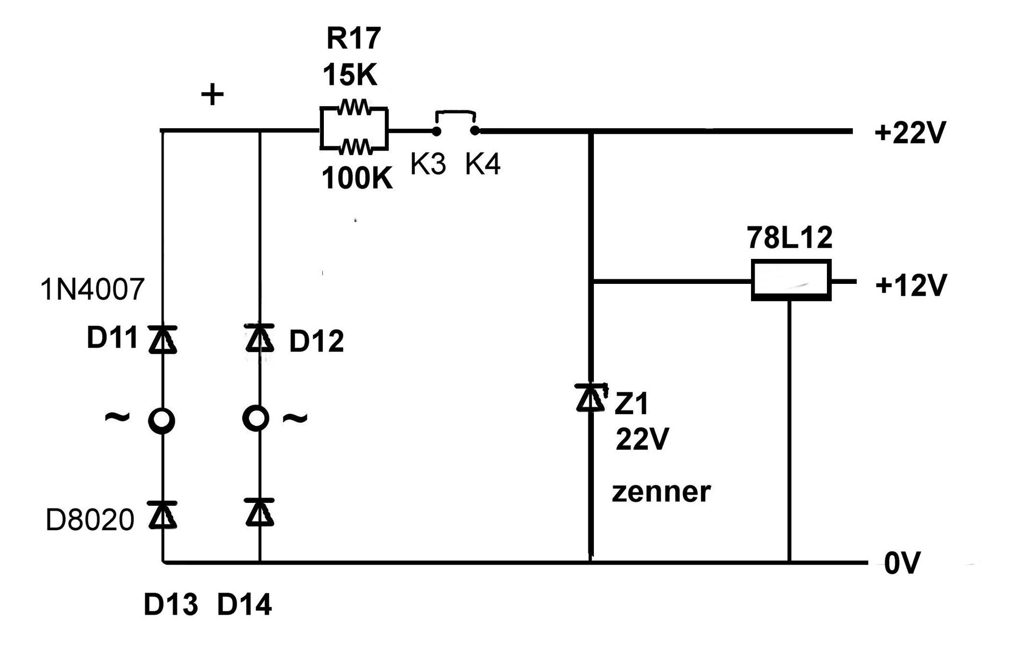 starting with Z1 the 22V zenner and the 78L12 regulator IC