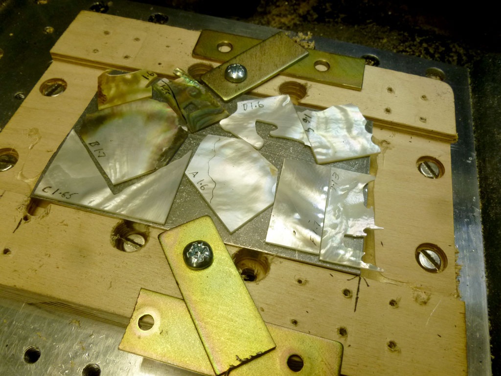 I superglued the pearl blanks down to a plate of aluminium, scanned that in, then (in Illustrator) positioned the vector shapes where I needed them to fall on the blanks and added a datum at the bottom left which I matched with my x/y zero in CAM and in turn zeroed off my machine at that corner too. It's reasonably accurate, but you can get a bit of a shift if what you've scanned isn't sat flat on the scan bed - here the alu plate was nearly a couple of mm off the surface due to the pearl blanks, so its relative position to the pearl blanks wasn't represented exactly in the resulting scan. At this scale it's no big deal, but if you're going right to the edge of a blank it pays to check that your tool isn't riding off the edge at some point in the cut - if it is, just tweak the x/y zero on the machine.
