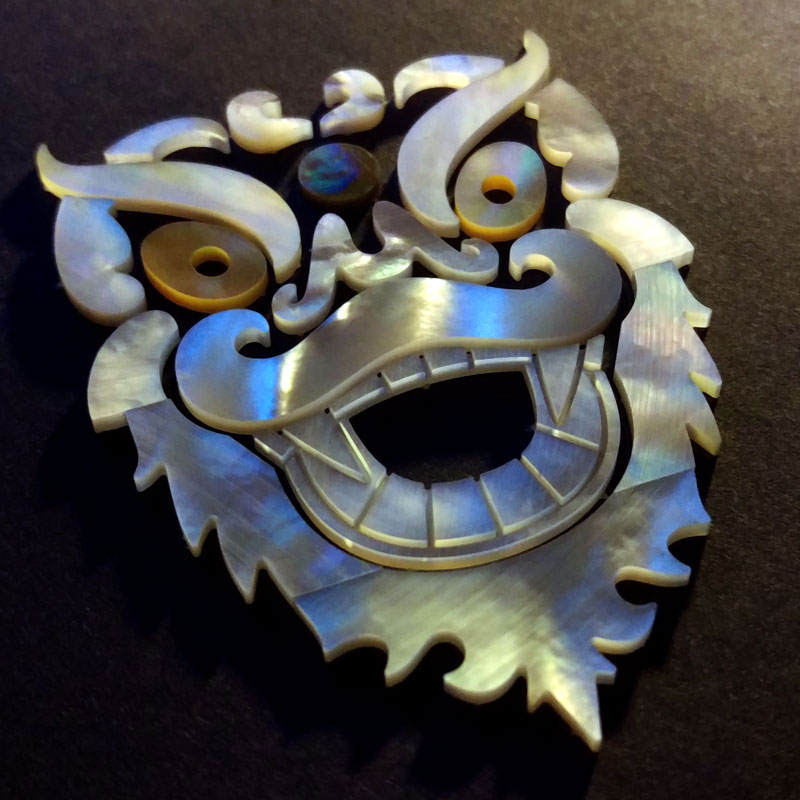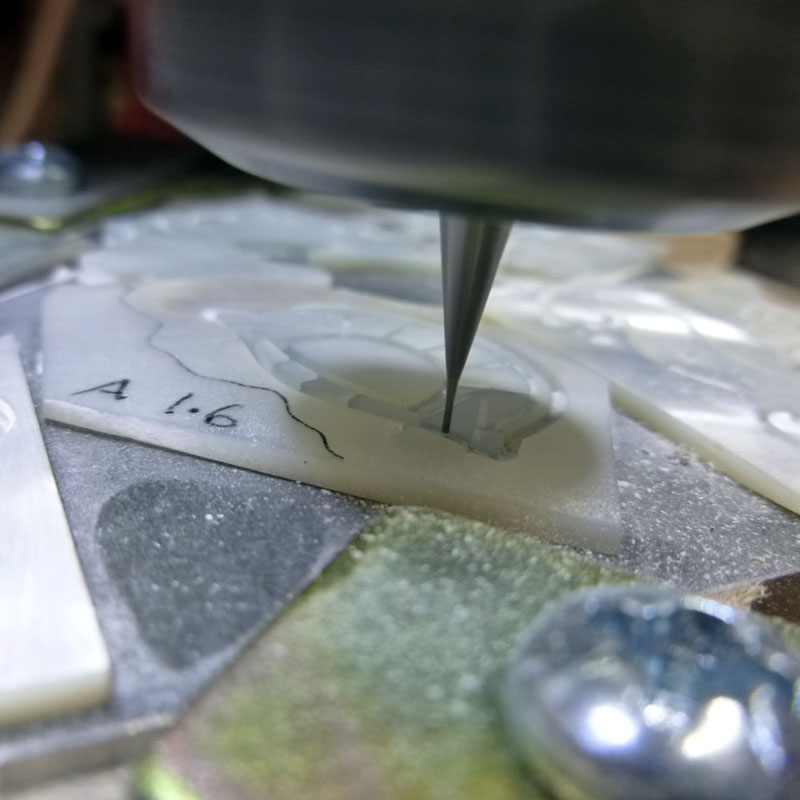 Cutters used for the wood were 2mm (for a rough pocket with about .15mm allowance) then a 1mm followed by a .5mm for the detailing around the profiles - these were programmed as being .06mm undersized to give a bit of clearance for the mother of pearl shapes to drop in.