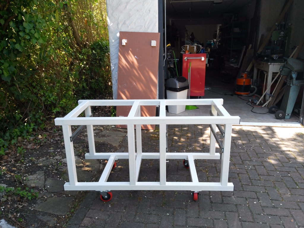 Built the stand as shown in picture 1. silver rails are drawer runners for mill parts. Centre section houses drivers power supplies and electrical stuff. Kitchen worktop in picture behind forms worksurface.