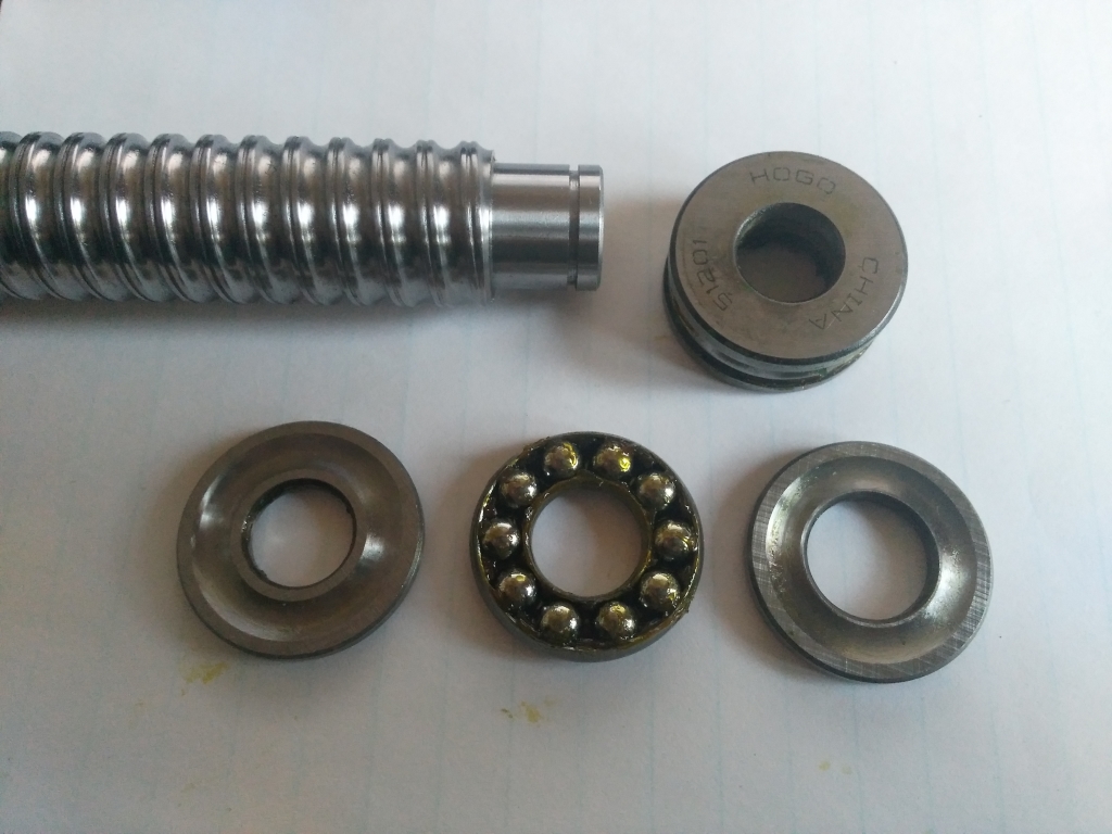 The conventional method is to use deep groove ball races for the axial thrust at the ballscrew ends. This BK/BF system uses two races in which the outer part of the race is spaced apart and the inners compressed until they rotate with little axial movement. balls used in this way run on the edge of the grooves in the casing, which makes me unsettled. Using a thrust race for axial loads the ball is fully supported by the machined recess in the support washer, so a much larger area of contact is used.