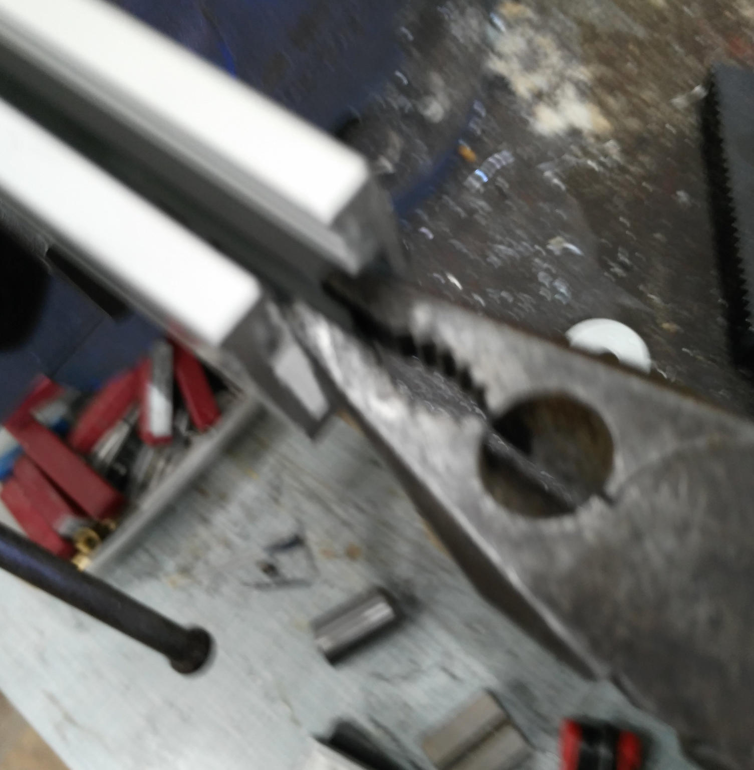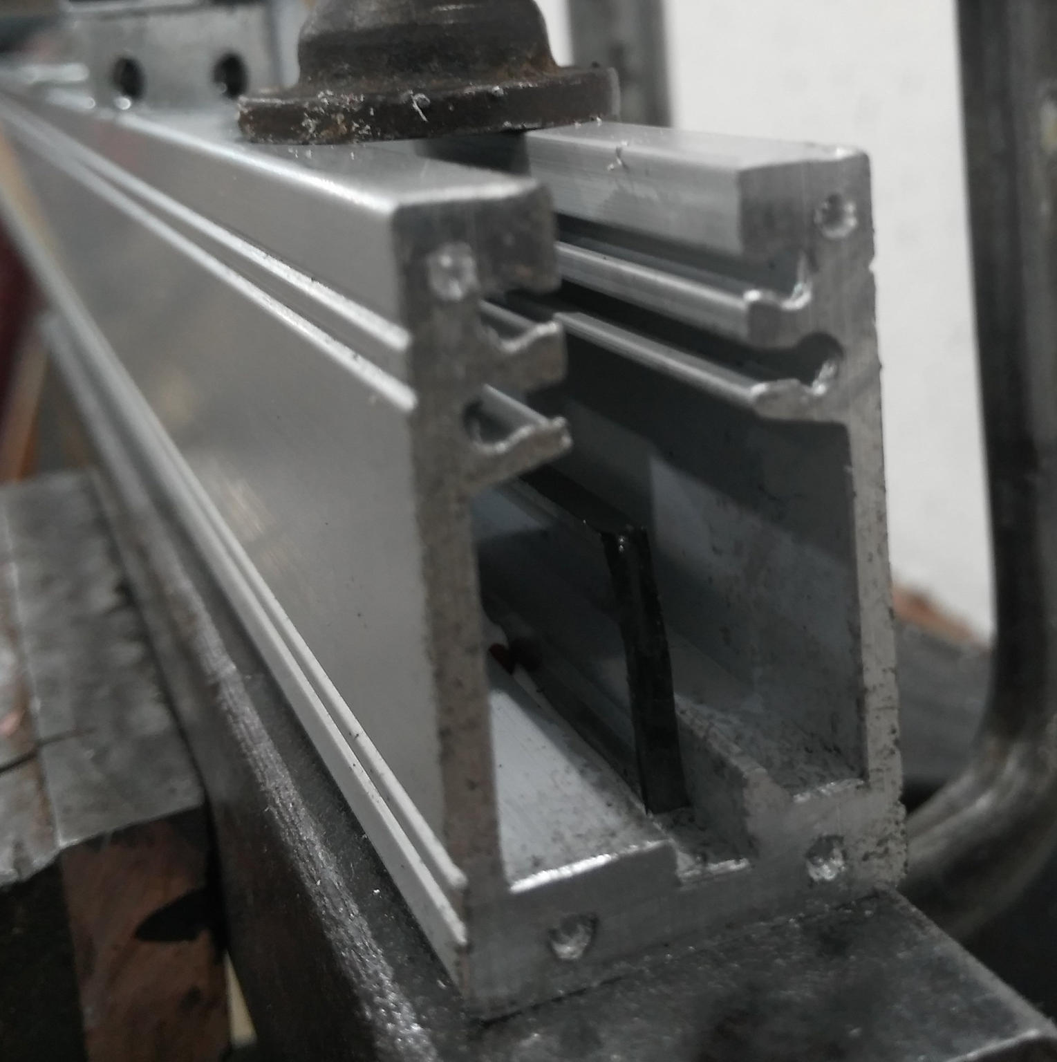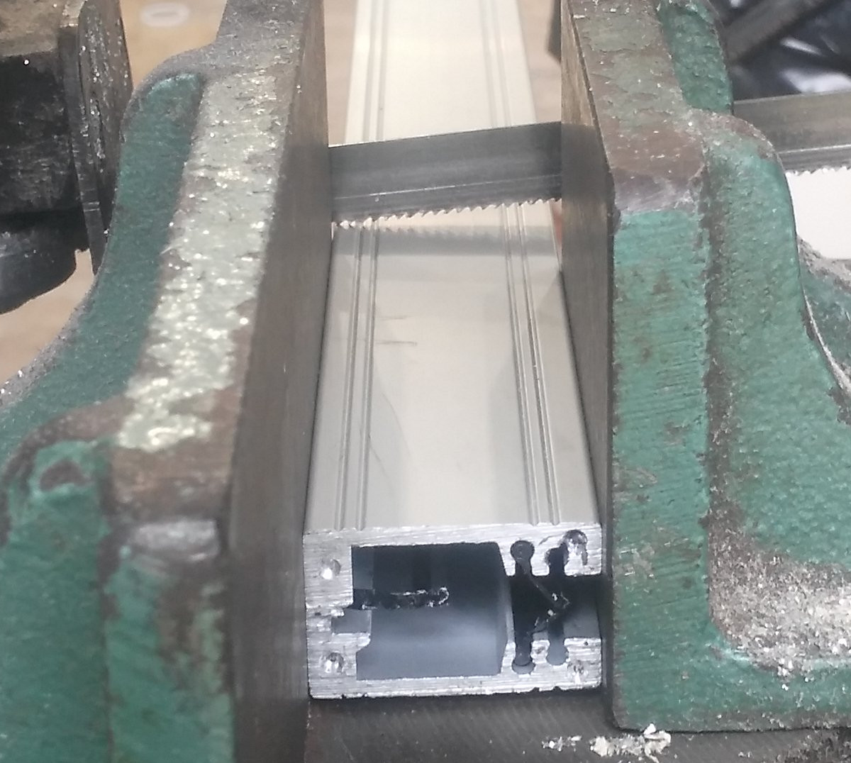 To shorten you will need a tap and drill for the end screws, a BS1 centre drill and some general workshop tools, clamps battery drill, vice etc. . The end screws are generally m2 or m2.5. I will generally fit M2.5 as they feel more secure to me (we all have our foibles :-)). Firstly remove the end cap and read head. Place the read head and cable somewhere clean for later. Slide out the seals, or just remove the other end and pull them out of the way. Next cut the extrusion/glass to the travel length+80mm(read head)+ min 20mm overtravel. I have found the best way is to use my 6x4 bandsaw with the open end of the extrusion facing away from the motor so that the open edge gets cut last. The lower face of the extrusion should be the one that supports the glass. See pictures. Next take a pair of 1/2” pliers and break the end 4-6mm off of the glass. Its important to bend the glass away from its supporting edge or it will break longways. This glass is really soft and breaks very easily, you can even just crush the end. Remove the debris and place the extrusion in a mill to square up the end.
