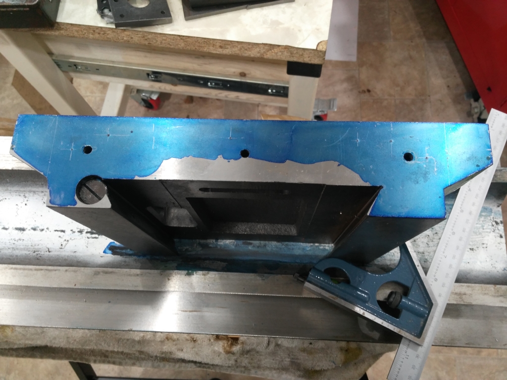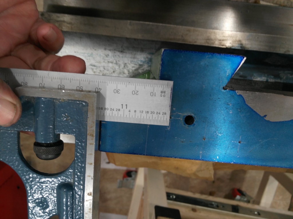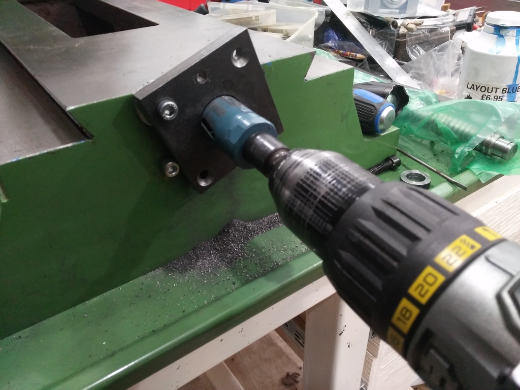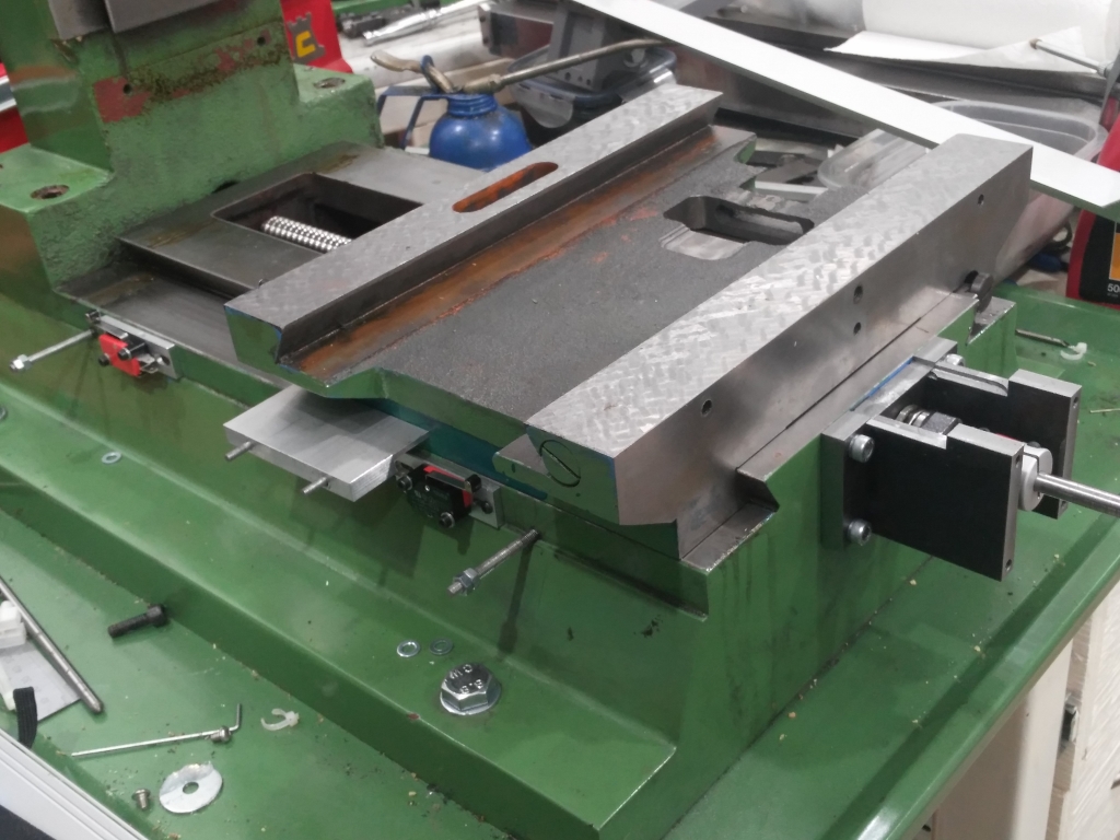Sketch with dimensions is really just my crib sheet so take it with a pinch of salt. Also check dimensions of your machine before assuming my drawing is correct. Initial test install of the ballscrew showed an issue with the hole in the front base of the machine. This was approx 1mm too small for the thrust bearing I was going to use. This was opened out using a 33mm hole saw. The position of hole saws is tricky to maintain without a pilot hole to guide. Positioning was achieved by use of a metal plate turned to the outside diameter of the saw cup. This was a simple and successful way of enlarging and centering the hole. The table and saddle were then marked out using a scriber and engineers blue, then drilled and tapped. As shown on one of the pictures its easy to use a metal piece with a right angle cut out to align the drill/tap perpendicularly. The base was similarly treated. To get good right angle holes and threads tapped into the base the drill needs to be held horizontally. This can be simply achieved with a few books or magazines under the drill body, piled to the correct height. I have used std V5 microswitches, the Y ones are mounted on a carrier plates for simple adjustment. Last pictures show the current state of play.