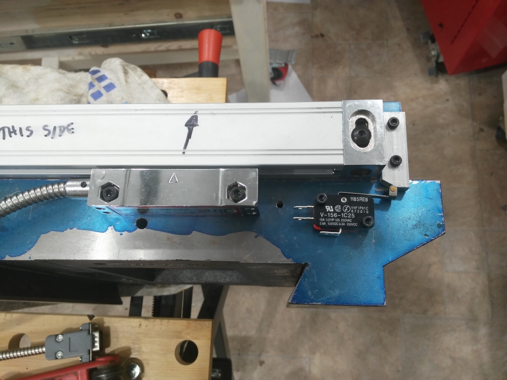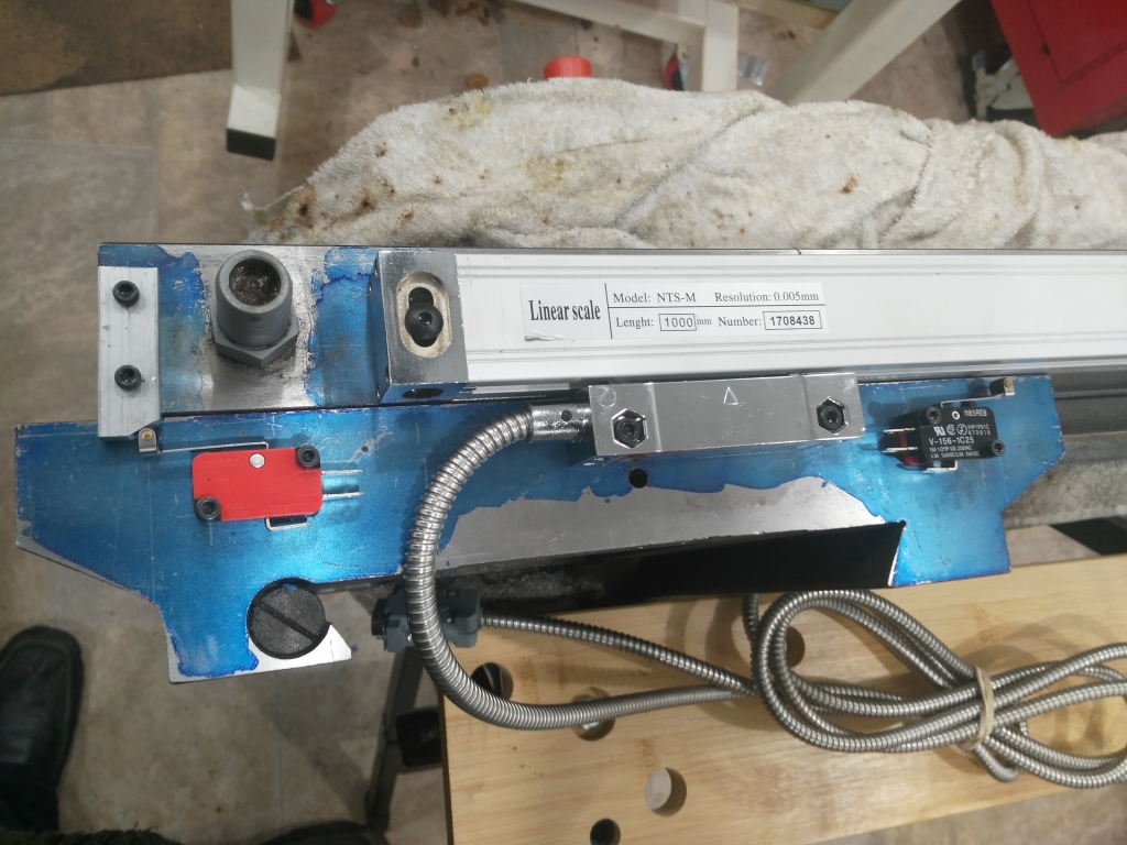 As this conversion will use glass scales I have used the Y scale bracket to trigger the microswitches. The rear of the saddle has the X limit microswitches, and the left of the saddle the Y. I will upgrade these at a later date to improve the homing accuracy using a latching optical disc sensor I read about here :-