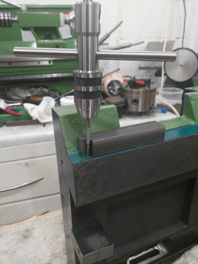 Sketch with dimensions is really just my crib sheet so take it with a pinch of salt. Also check dimensions of your machine before assuming my drawing is correct. Initial test install of the ballscrew showed an issue with the hole in the front base of the machine. This was approx 1mm too small for the thrust bearing I was going to use. This was opened out using a 33mm hole saw. The position of hole saws is tricky to maintain without a pilot hole to guide. Positioning was achieved by use of a metal plate turned to the outside diameter of the saw cup. This was a simple and successful way of enlarging and centering the hole. The table and saddle were then marked out using a scriber and engineers blue, then drilled and tapped. As shown on one of the pictures its easy to use a metal piece with a right angle cut out to align the drill/tap perpendicularly. The base was similarly treated. To get good right angle holes and threads tapped into the base the drill needs to be held horizontally. This can be simply achieved with a few books or magazines under the drill body, piled to the correct height. I have used std V5 microswitches, the Y ones are mounted on a carrier plates for simple adjustment. Last pictures show the current state of play.