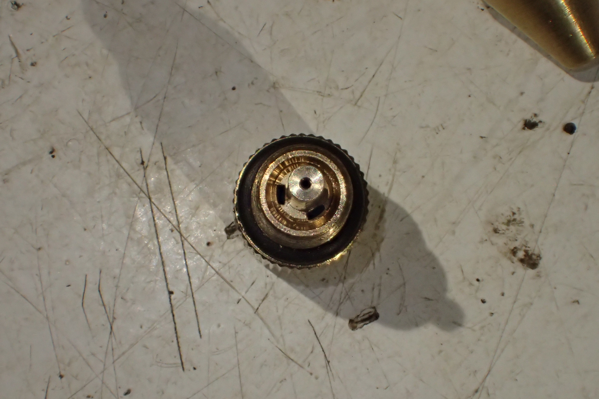 the inner coolant nozzle has the same pitch thread as the outer collar, so threads into the collar when it's put on. The lack of puff looked like it was being caused by the very small apertures: