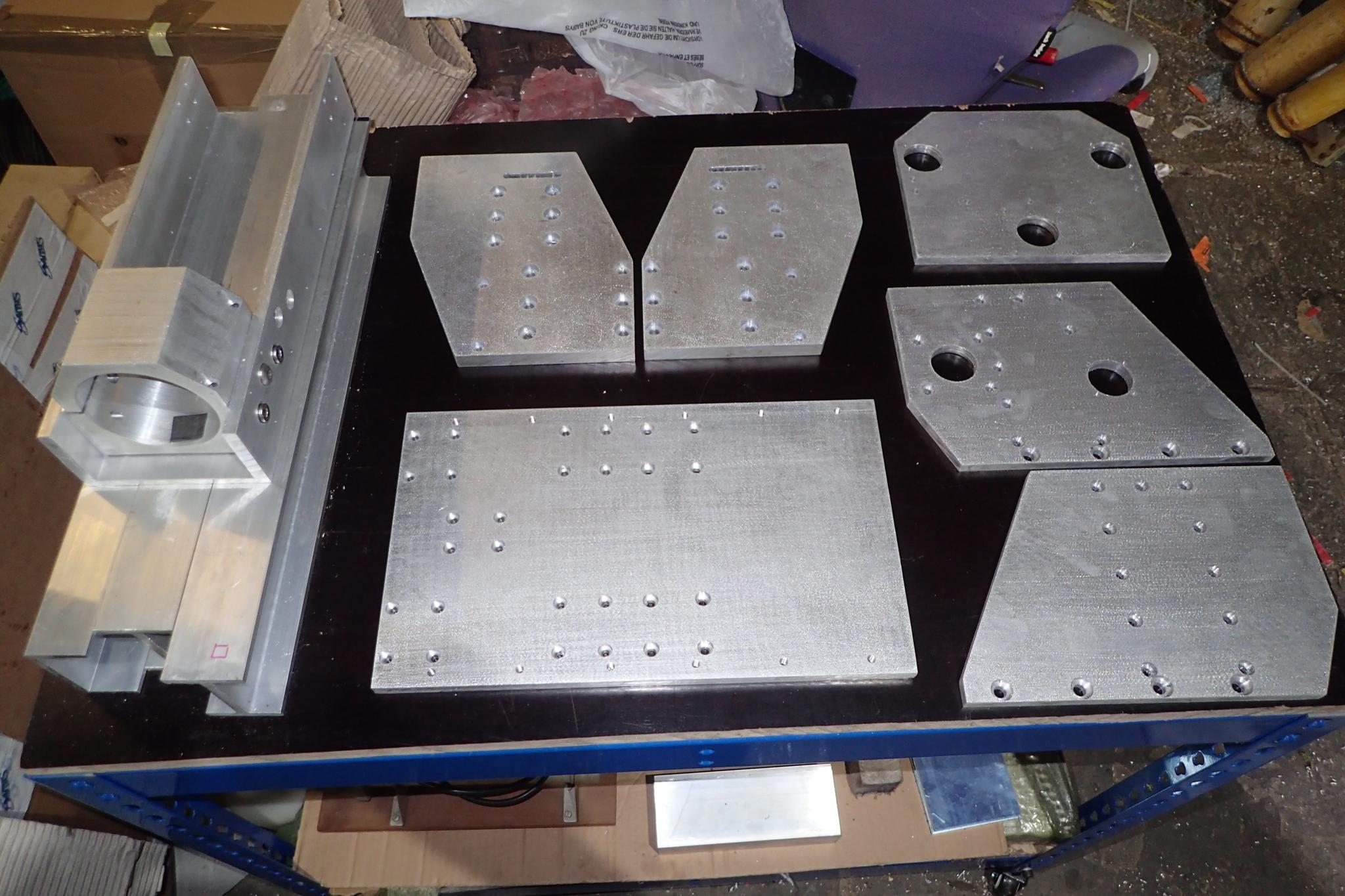 From LHS clockwise we have Z axis slide with clamp sitting on top of the bed cross beams, front bed end plates, Z axis top plate, gantry end plates and the Z axis back plate. Just hit a bit of a snag though - the big bit of plate for the top of the bed has been cut well off square by the folk at Smiths - thus even with the 2mm tolerance oversize by the time it's trued up it will be 2mm short causing a few major headaches - I will be bending their ears on Tuesday