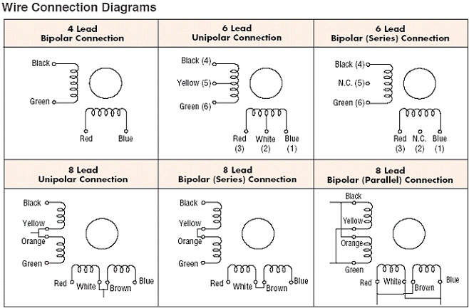 There are three types of connection for a stepper motor, unipolar, bipolar series and bipolar parallel. Nowadays most are wired bipolar parallel because they give best performance. Compared to bipolar parallel, the biplolar series has the same torque but it drops twice as fast at high speed. This gives half the maximum usable speed of a bipolar parallel. The unipolar wiring has the same speed performance as the bipolar parallel but only half the torque to start with. Old motors were wired unipolar as the drivers was easier to build and cheaper.
