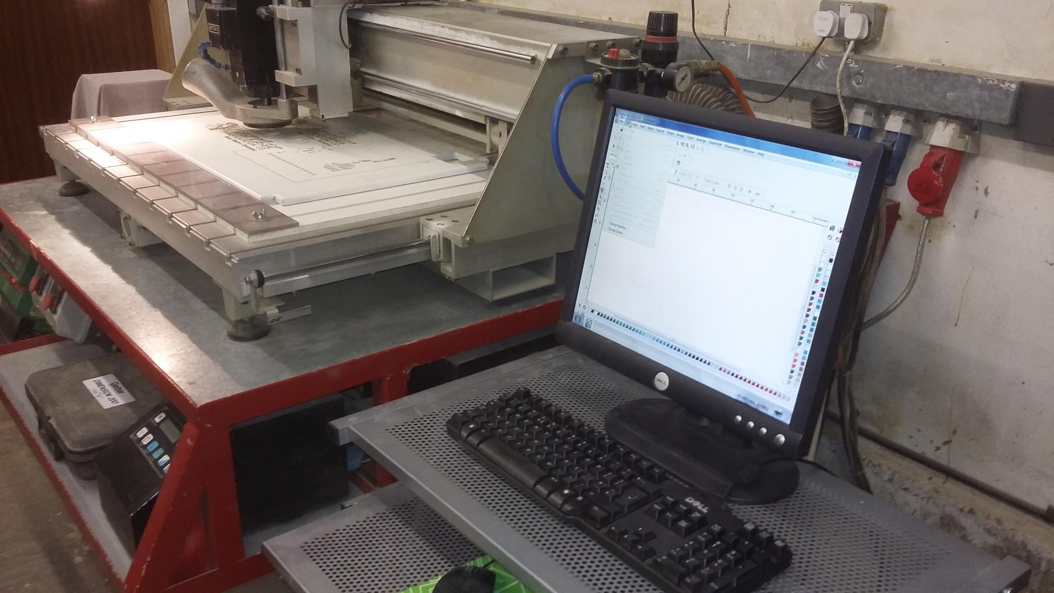 Gerber Dimension 200 Router. Boxed Omega 2 software and USB key complete with manuals included. This will need a computer running Windows XP with a serial connection . Selection of router bits and collets. Perske spindle for fine work and Porter Cable router for heavier work. Vacuum pump for hold down table and compressor for mist coolant for cutting non ferrous metal. Machine light .The machine is on a purpose made wheeled table to make it mobile but it is heavy.