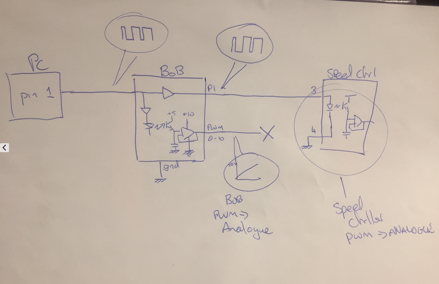 Rough-arsed sketch - the PC output pin-1 is a digital PWM output. The BOB routes this to two different outputs - the BOB "P1", which is a facsimile of the PC output - and is the signal you need. There's also an on-board (the BOB) integrator that converts the PWM to the analogue output, that you don't need. Your speed controller takes a digital PWM input and uses this either to generate the analogue drive to the onboard speed controller, or simply uses this to drive the onboard MOSFET to drive the spindle. Regardless, the important bit is that the speed controller around the pin 3/4 terminals is designed around having a Digital PWM input, and NOT an analogue input (which, confusingly, is derived from a PWM source)