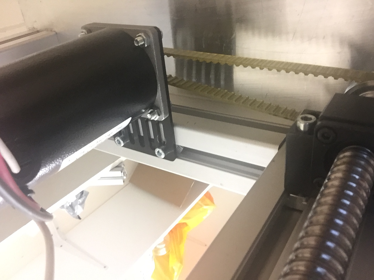 finally, a quick test fit of the servos to see if there is enough pulley adjustment range (broadly planned that there should be throughout the build!) and to check whether the belts I have are of suitable length. I need to buy a slightly longer Z axis belt, you can see that the servo doesn't quite mount properly as is - I had to shorten the support extrusion for it during the build as I couldn't be arsed to cut an indent to go around the ballscrew bolts.