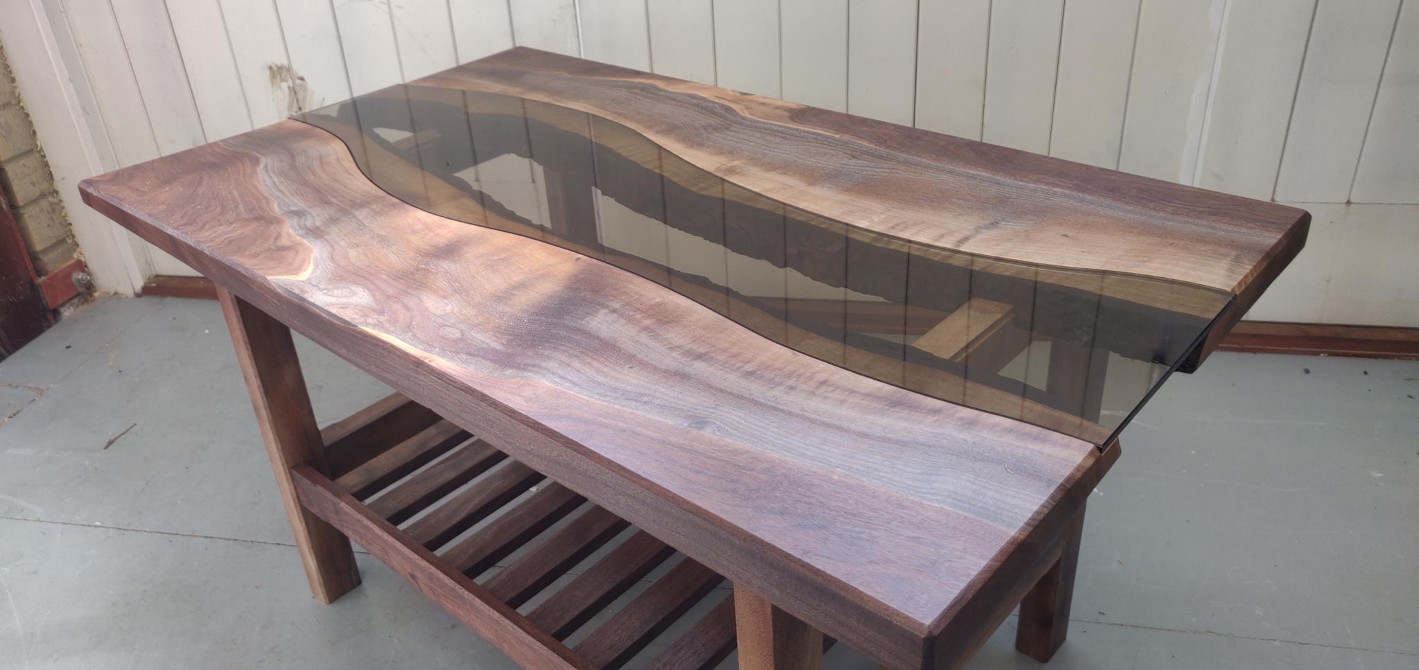 Example is this glass and walnut coffee table. The slab of walnut had warped badly and flattening both sides would have left me with less than 15mm of thickness, so I had abandoned it in a corner. However with the CNC I first flattened the top (so much nicer on my CNC with built in dust collection than using an ad-hoc sledge). However then the operation specifically enabled with CNC was to flip the top and machine just two slots where the frame rails could sit. The rest of the underside could remain rough sawn and unfinished. I then added a dovetail housing as well.