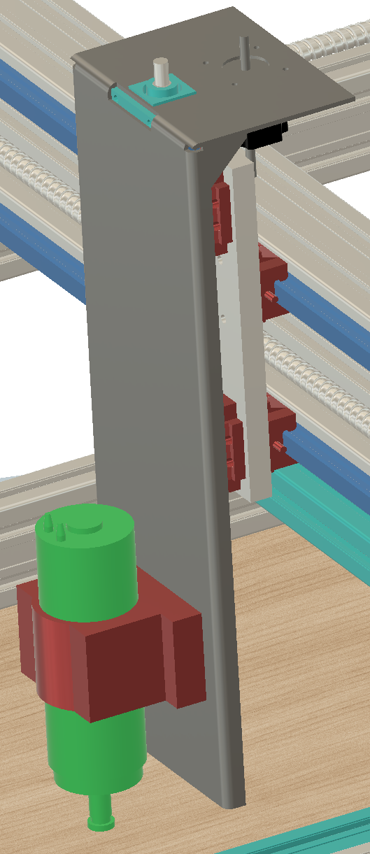 The Z-Axis got completely changed. Where it was a complex part before, it is now a rather simple bent sheet steel piece. The motor is now also affixed to the Z-Axis itself, and is moving with it. This is to keep the Gantry-side Y-Axis sled small. It also theoretically means, that I don't need to change anything but the Z-Plate, the rails and the Gantry sideplates to add more Z-space later on, if I ever decide on it. All in all, I like the design change of putting the bearing blocks on the Gantry sides, and the rails on the Z. Allows the parts to shrink a bit. That is one design change I picked up from AndyUK's build. The Ballscrew is also mounted on the moving Z-Axis, with the Ballnut being fixed on the Gantry Sled. One question that I still have, however, is how the cutting spindles actually get mounted to the Z-Axis. I understand that the spindle itself is mounted in the red aluminium ring, but how is that ring mounted? None of the pictures I could see in the offers showed any mounting holes. Are you meant to drill those yourself?