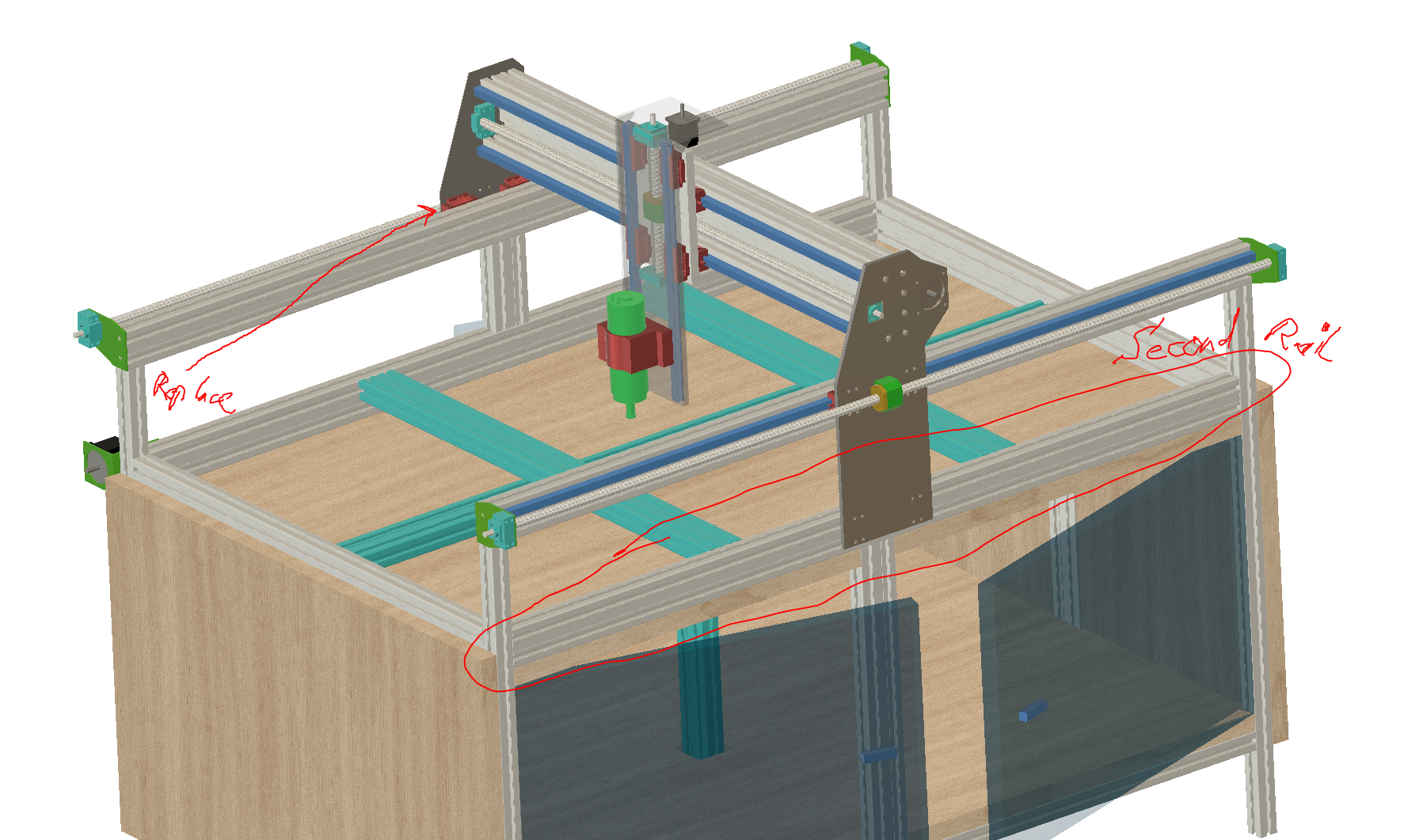 - I question the Z axis travel length and why the plate is so large - Don't forget you'll have a bit attached to the end of your spindle, and its going to have to be quite a long bit to make use of your Z travel. I've got 18cm, and honestly, its probably far too much, most of the time you're really only needing to cut say 18mm plywood! The distance between the bed and the gantry looks huge - All that Z extension reduces the rigidity of the machine. Have a think about what you really need - can it be acomplished in other ways, such as an adjustable height bed or overhang section which keeps everything stiff for the majority of the time, but when you need to use the router on something large you can?