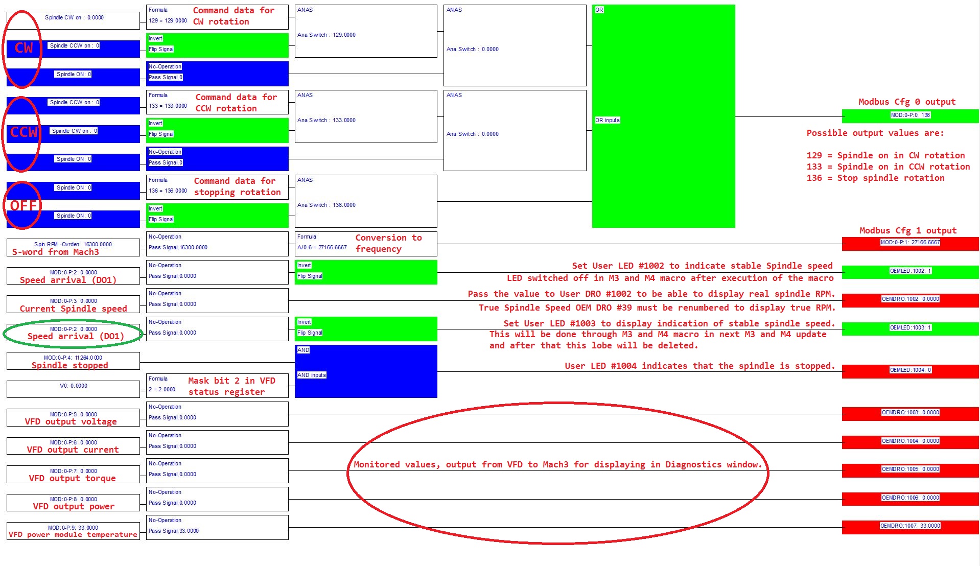 Note again that if you are only interested in basic functions (CW/CCW/Stop/RPM) than you only need what is connected to Cfg #0 and #1, which are the two first lobes, i.e. the ones marked CW, CCW and OFF, plus the one where it says "S-word from Mach3". I have edited in some explanations in red, and those I think are pretty simple to understand. Ask if something is not so clear, I'll be glad to explain. Start up brain editor and create your own file using mine as guidelines. I will not post the brain file itself because this way you'll learn more in my opinion.