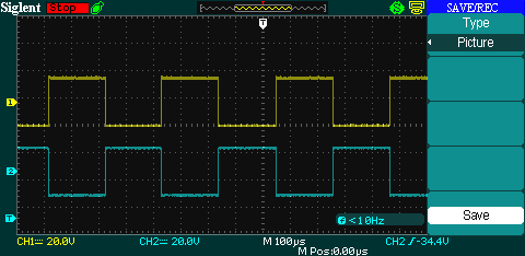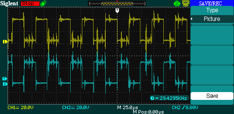 Four pictures below of encoder channel A, at the controller, three at different speeds and one taken direct from the drive output with cable to controller disconnected.