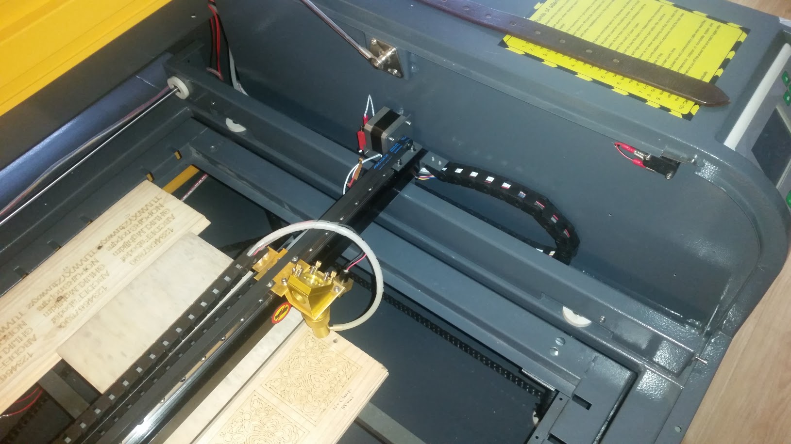 What i have here is a big'ish laser cutter (80W, 600x900mm bed) which is driven by 2 steppers, one for gantry (Y) and one for head (X). Both NEMA17 sized.
