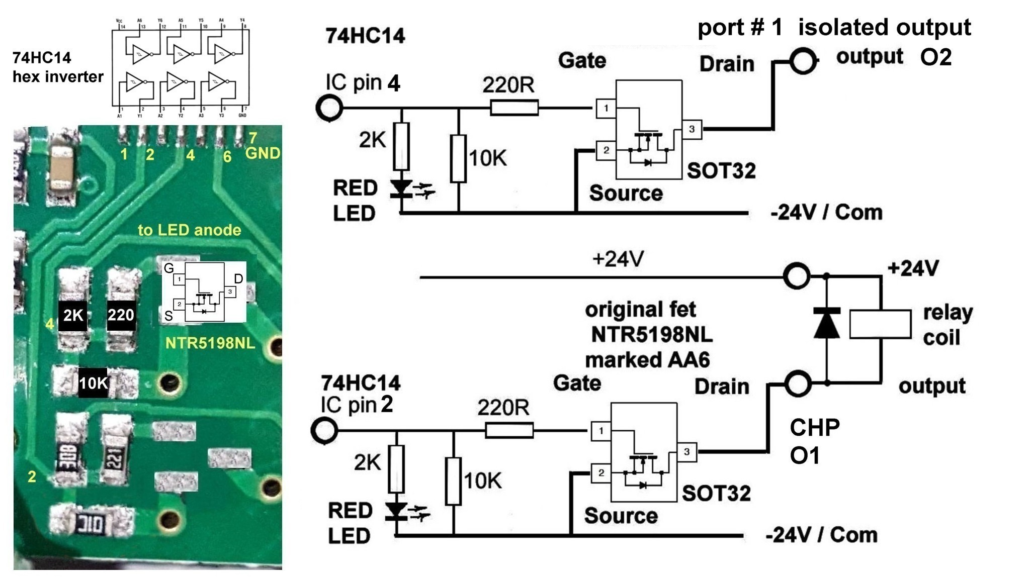 you will find the via (plated through hole ) in the copper trace connecting the 10K resistor and FET source is the – 24V supply - making it an easy test point