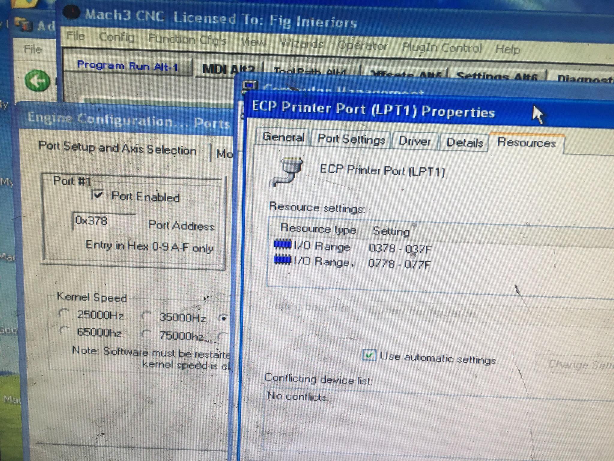 OP/Mitch. For information. I was playing this morning with an old XP machine that I'd been previously using with Mach3 and an ethernet motion controller. I was having exactly the behaviour that you described during my diatribe yesterday - no response from Mach3 to any of the parallel port settings. Using both a DMM and oscilloscope I could get no joy from the parallel port, even though Mach3 was configured for parallel port interface.