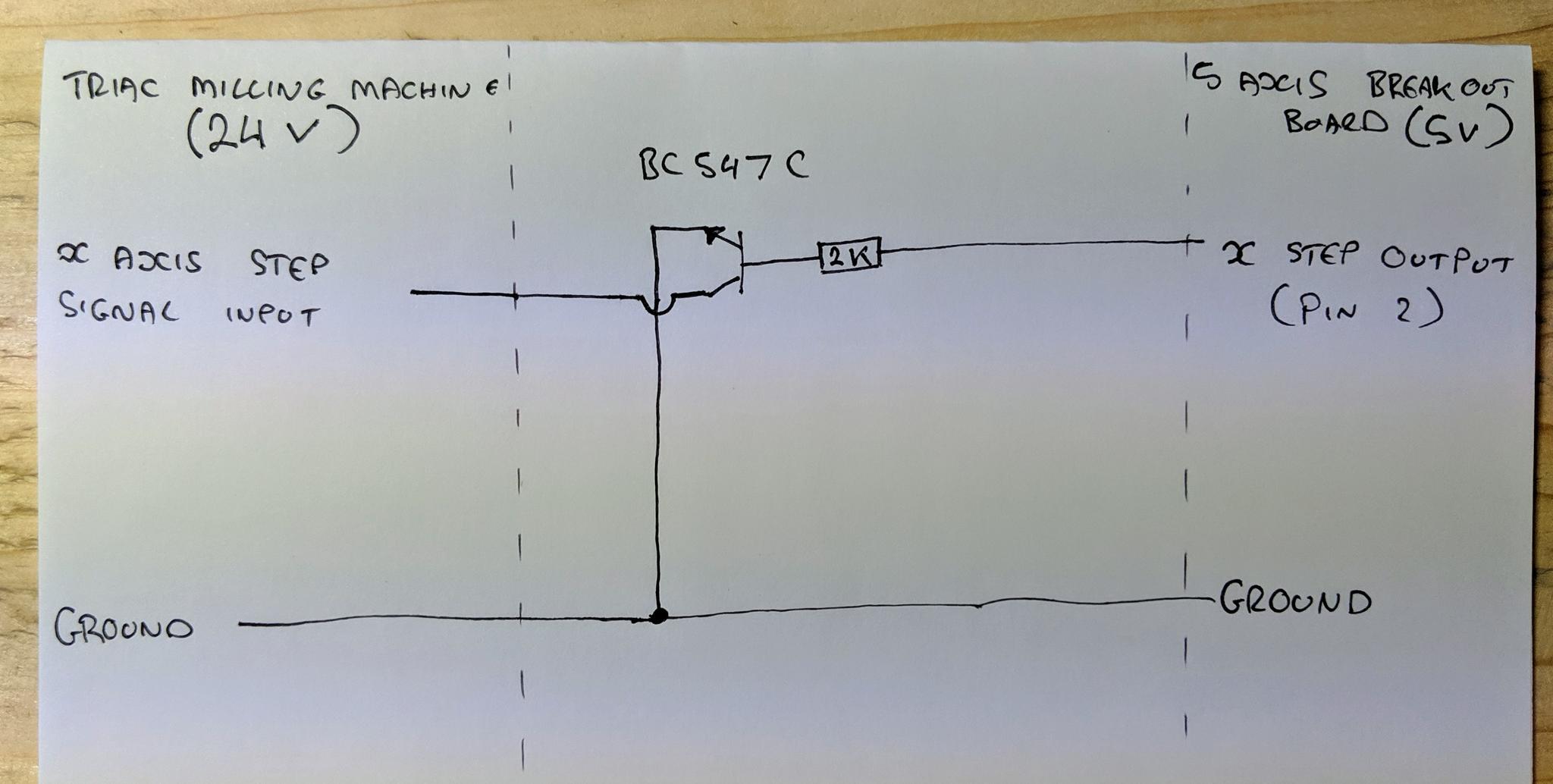 I believe I have replicated the circuit correctly, and the X axis does step once when I connect the wire from the base leg to pin 2 on the BOB, but jogging the X axis has no impact. I have also moved the wire from Pin 2 to 3 on the BOB, with no affect. Pin 2 is the X axis step and 3 the X axis direction.