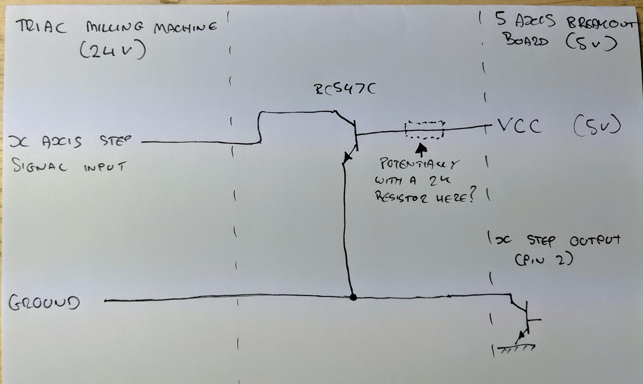 Thanks for your input. I've been racking my brain trying to work out how to get the open-collector transistors to send 5V to the Base on the transistor required to power the Step signal on the milling machine driver. I've drawn out 2 circuits, the first it the one I have already tried and it failed, but when I connected the 2K resistor directly to the 5V source on the breakout board, rather than the X step output (Pin 2) it did cause the X axis to step once. The second circuit is my version 2, do you think this would work?