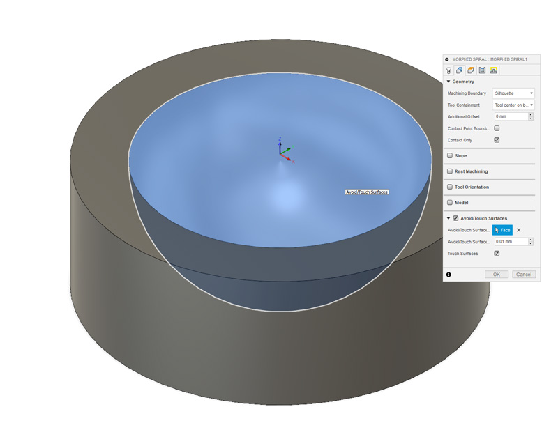 Similarly, in F360, depending on what tool strategy you have chosen, there is often a way of telling the program which surfaces you want to cut or avoid. Check out the pics below. It's as easy as ticking the touch/avoid checkbox and selecting a face. Very neat.