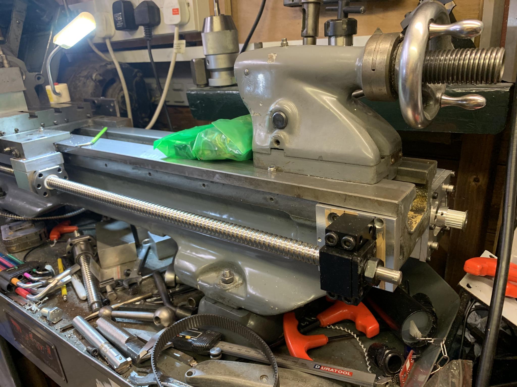 Cheers for the photos - very interesting and useful. I do, and don't like your approach on the saddle - it's a nice design but for my purpose I think it protrudes somewhat into the user space (I've a 13' by 7' shed so have to tip-toe between benches and lathe). But I agree with the two MPGs (I've got one knocking about somewhere) - think that's a necessary solution to keeping a semi-manual mode on the lathe.
