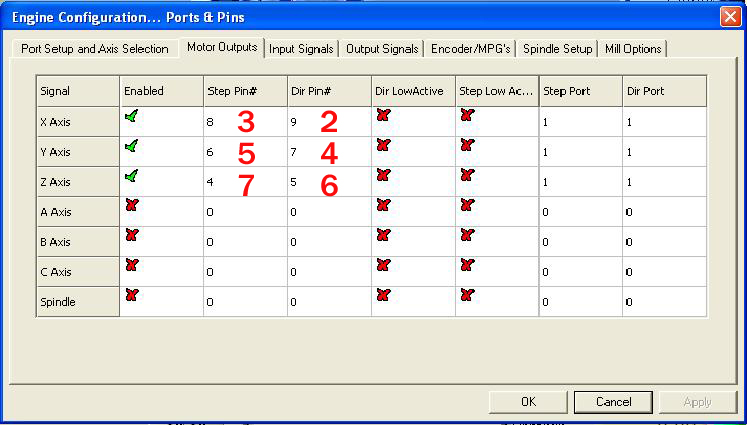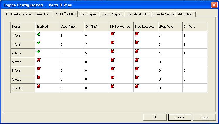 I used a uniport board on my machine and from memory these were all incorrect when I first installed mach3 and I had to change all of the values to get my steppers to run.