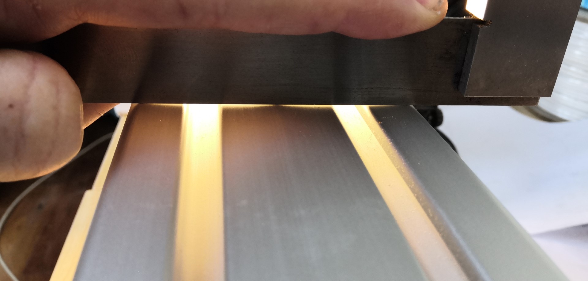 This shows that the profile is not flat across the width which I believe is by design so that the slots pull up to meet whatever you are clamping to them. The slot edges are 0.15mm lower than the centre, the centre and the 2 corners are perfectly aligned within the resolution I can measure with finest feeler gauge.
