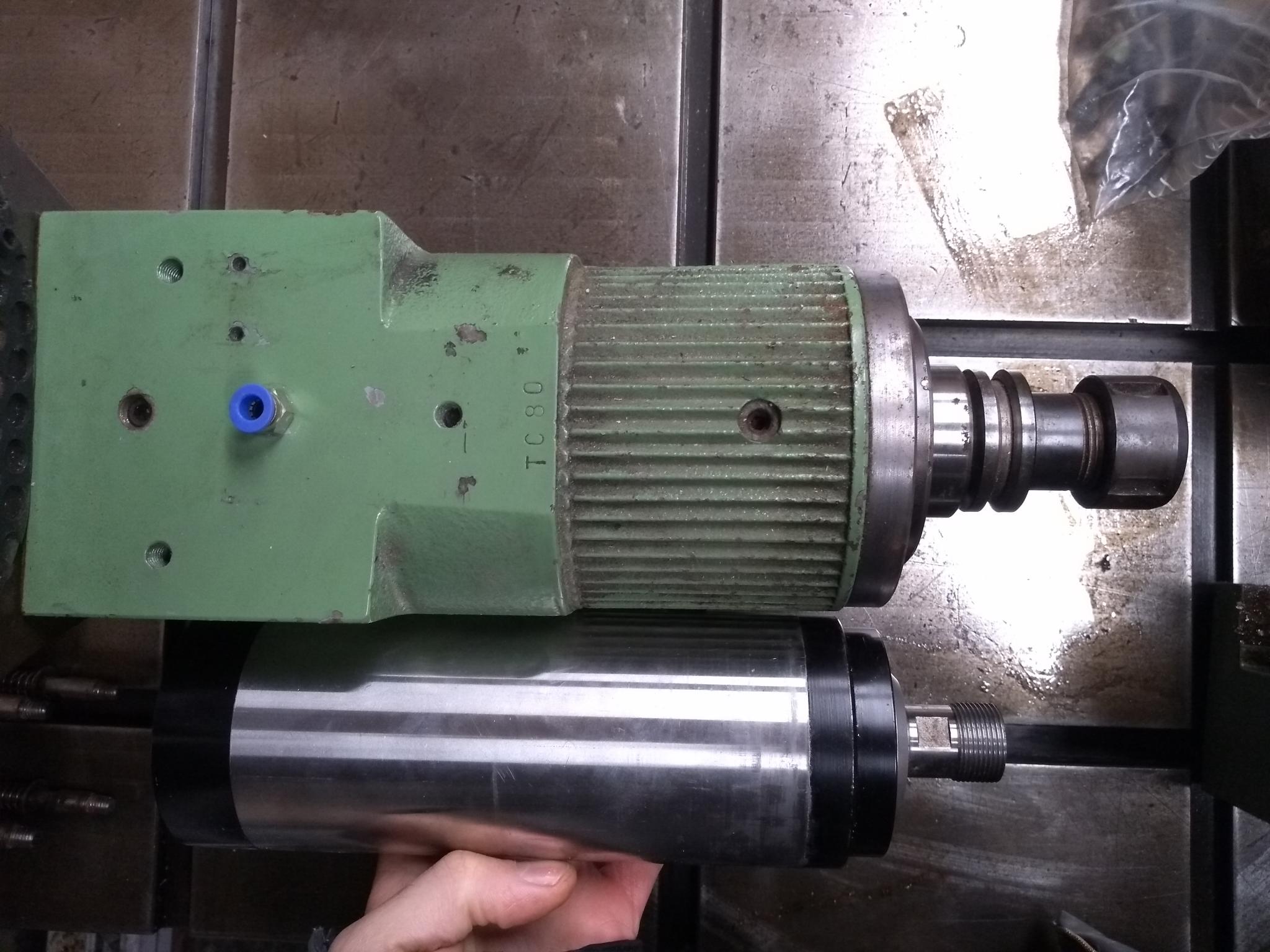 Full disclosure, I do have the spindle I intend to use already - if it proves a massive mistake I can swap on a different spindle later with minimal fuss. Hopefully the picture makes the point (I tried to keep the perspective fair) - it's obviously much bigger than a basic 2.2kW Chinese jobby, but not that big...80mm vs. ~110mm...so also a bit bigger than a basic 3.0kW unit (though obviously unpowered). Consider that a decent amount of the stickout is that particular toolholder, the tidy integral mount (and unpictured belt guard), 30 taper tooling, hydraulic drawbar release, reassuring derating (from 7.5kW / 20,000rpm), I can change the gearing, and that it's rated for use from 0 rpm (though I wouldn't be that mean to the bearings). Cheap, simple motors and VFDs appeal too. I'll concede it's heavy and air-cooled.