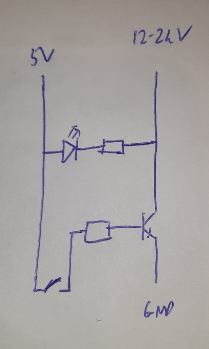 I can't see what it is supposed to do! I presume it is some sort of switchable state indicator for the 12-24v and you don't want it to interfere with the logic of the 12-24v line. Do you have any resistor values yet. I presume that you are intending to use a small signal NPN, in which case you will need a current limiting resistor to stop the magic smoke (or is the 12-24v line already limited).