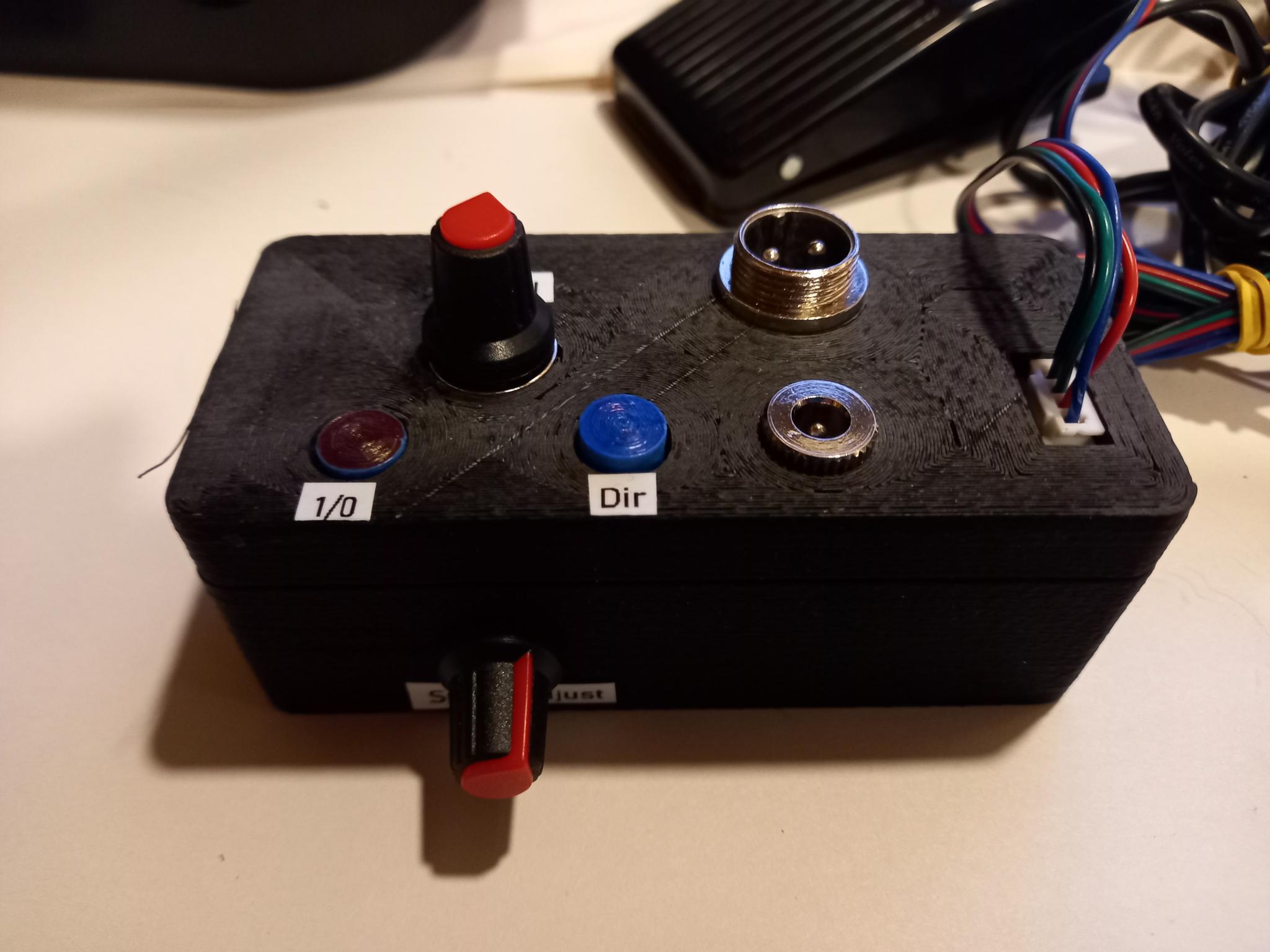 The electronics are a Nema17 driver board and an oscillator made to feed the signals to the driver. Controls are On/Off, Direction, 3 speed ranges, and pot for fine adjusting the speed.