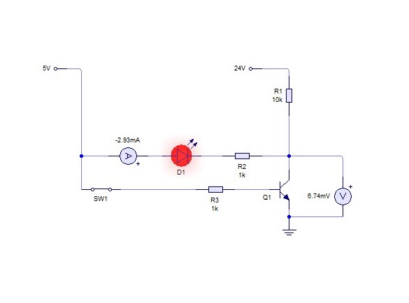 If you're dropping nearly 12v across R1 with SW1 open there is something seriously wrong! The collector of Q1 should be at the full 24v. On reflection there should be a pull-down resistor (10k would do) on the base of Q1 to hold it to 0v when the contacts are open, otherwise the base is left floating which should never be allowed to happen. I suspect your emulation software has picked up on that fault and is allowing Q1 to partially conduct.