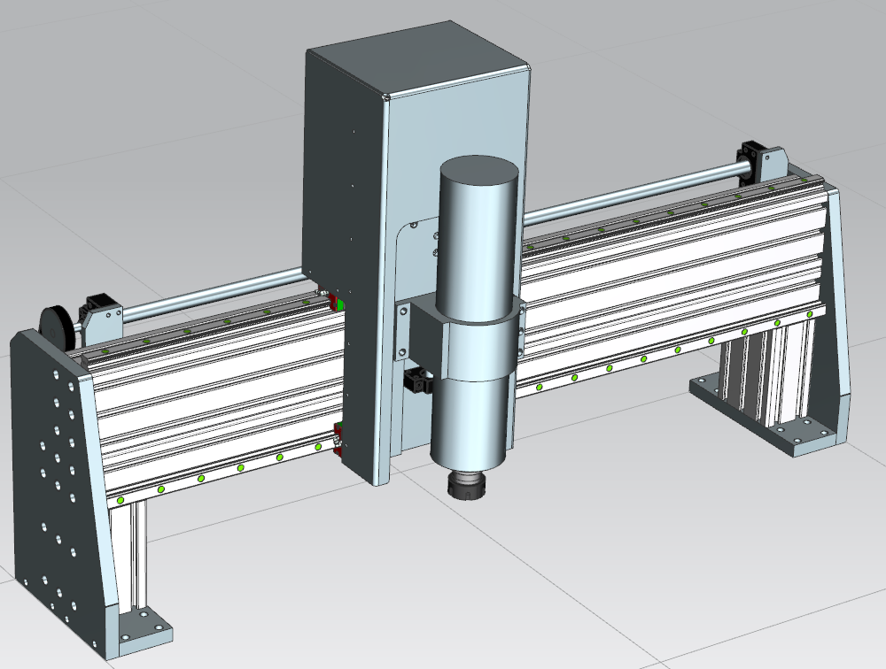 - 20mm aluminium gantry side plates, bolted to both the L-section and the high side gantry profiles. It is also bolted to the bottom plates, that will be mounted to the Y-axis bearing plates. The purpose of the bottom plates being separated from the Y-axis bearing plates, is to allow some adjustment later when squaring the gantry.