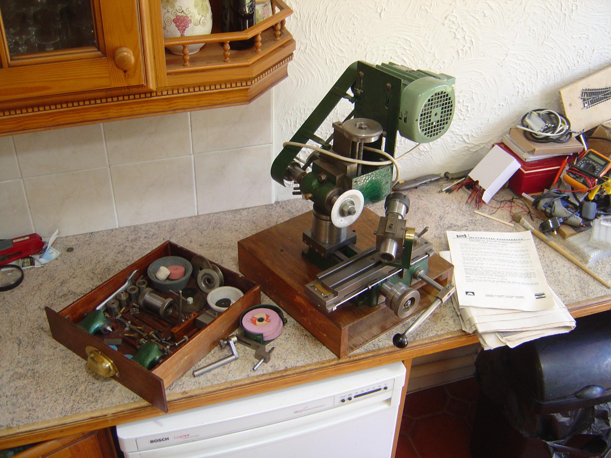 Stent tool & cutter grinder with many accessories. Centres, ER32 grinding spindle. Standard grinding spindle with collets.Spiral followers, and diamond dresser. Many spare wheels mostly new. Fitted sturdy German reversing motor. Full set of plans. All in excellent clean working order.